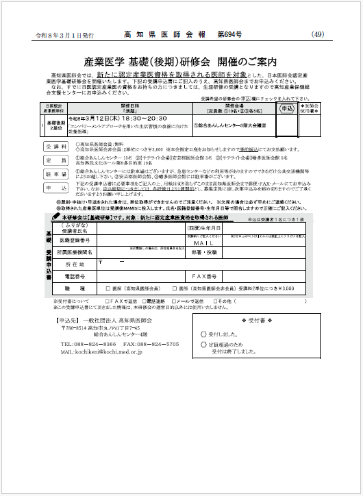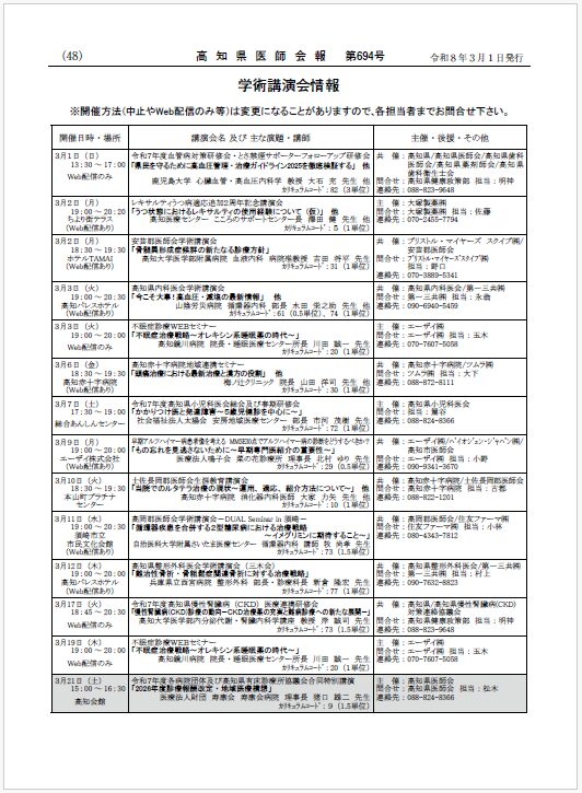 【会員専用】高知県医師会報3月号を掲載いたしました 医師・医療機関の皆様へ感染症について新着情報産業医単位取得可能研修会研修会について2026年03月01日 詳細はこちらをご覧ください。 ※会員専用ページへログインするにはIDおよびパスワードが必要となります。 ご不明な場合は高知県医師会事務局までご連絡ください。 続きを読む