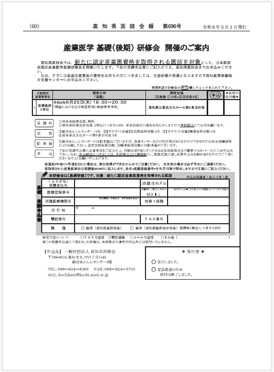 【会員専用】高知県医師会報5月号を掲載いたしました 医師・医療機関の皆様へ感染症について新着情報産業医単位取得可能研修会研修会について2026年05月01日 詳細はこちらをご覧ください。 ※会員専用ページへログインするにはIDおよびパスワードが必要となります。 ご不明な場合は高知県医師会事務局までご連絡ください。 続きを読む